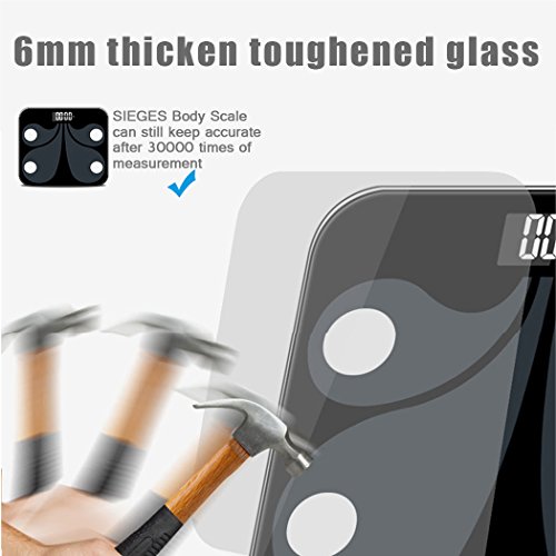 -. Feature : PRECISION PHYSICAL MEASUREMENTS: SIEGES Smart Bluetooth Body Fat Analyzer uses Bio-electrical Impedance Analysis(BIA) Technology to monitor 9 important body compositions:Body Weight in KG, BMI, Body Fat Percentage,Water, Skeletal Muscle, Bone Mass, Visceral Adipose, Basal Metabolic Rate. / SMART BLUETOOTH CONNECTIVITY: The Smart Scale can connect with your smartphone via APP "OKOK"(International Edition),This app works well with Android 4.3 & IOS 7.0 or above system(FREE downloaded from Apple Store & Google Play). / HIGH PRECISION SENSORS: "Step-and-Read" Immediate readings as soon as you step on the body fat scale, touch the 4 electrode areas on the surface of the scale with dry bare feet for high accuracy measurement (0.2kg-180kg) / SYNC DATA With APP: Scan the QR code to download the "OKOK" (International Edition)International App for syncing the measured data for recording the metrics of your body fitness data,you can create unlimited member accounts for your family members / SPECIFICATION - Auto-power-off, Auto-zero, Low battery powered(3AAA 1.5V), LCD display,weight capacity from 0.5lb to 400lb (200g-180kg),graduation increments of 0.1kg,CE/ROHS/FDA Approved