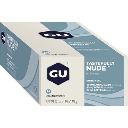-. Feature : The 100 calories of complex carbohydrates found in all 24 pouches of the Energy Gel 24 Pack are only part of the reason why Gu is such a ubiquitous sight in the peloton and on recreational rides. / Gu's Energy Gel also packs amino acids, antioxidants, and muscle buffers to help begin the recovery process even while you're refueling mid-event. / A splash of caffeine helps kick your engine into fat-burning mode, and the packets are easy to tear and eat -- no chewing, no two-handed fumbling, and no risk of choking on solid food during hard efforts at an unrelenting pace.