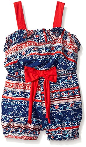 Navy, red printed woven romper with red shoulder straps and waist bow
