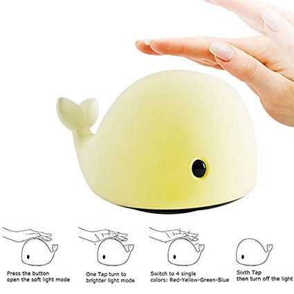 - [3 Light Modes & Tap Control]: Press the main power button on the bottom to turn it on/off. Tap the cute soft dolphin silicone surface to switch among normal white light mode, Stronglight mode, 4 single colors mode: Red / Yellow / Green / Blue, making it a romantic sweet nursery baby night lamp companion. Pretty sensitive vibration sensor allows you to control lights at will.