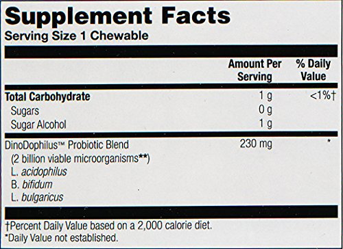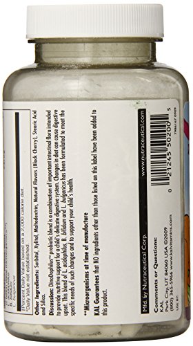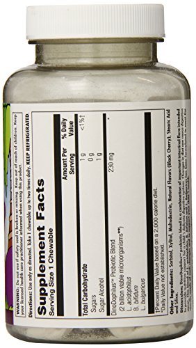 -. Binding : Health and Beauty -. Brand : Kal -. EAN : 0021245502005 -. Feature : Blend of L. acidophilus, B. bifidum and L. bulgaricus / Formulated to meet the specific needs of such changes and to support your child's health / Great black cherry flavor -. IsAdultProduct : 0 -. IsAutographed : 0 -. IsMemorabilia : 0 -. Label : KAL -. LegalDisclaimer : These statements have not been evaluated by the Food & Drug Administration. This products is not intended to diagnose, cure, mitigate, treat, or prevent any disease. -. Manufacturer : KAL -. Model : 021245502005 -. MPN : 021245502005 -. NumberOfItems : 1 -. PackageQuantity : 1 -. PartNumber : 021245502005 -. ProductGroup : Health and Beauty -. ProductTypeName : HEALTH_PERSONAL_CARE -. PublicationDate : 2014-03-30 -. Publisher : KAL -. ReleaseDate : 2014-03-27 -. Size : 60 -. Studio : KAL -. Title : KAL Dino-Dophilus Probiotic 2 Billion Chewables, Black Cherry, 60 Count -. UPC : 021245502005