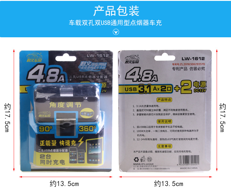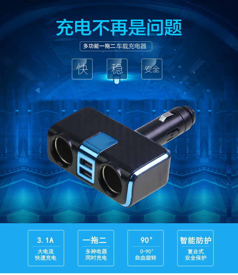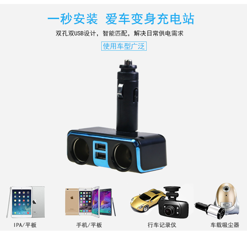 2.u0026nbsp;u0026nbsp;本产品为一分二的点烟器插座,100W大功率;USB大输出电流为3.1A,可同时为一部IPAD和一部手机充电