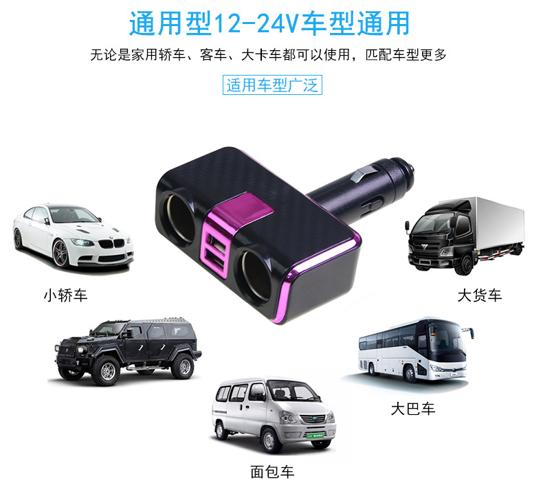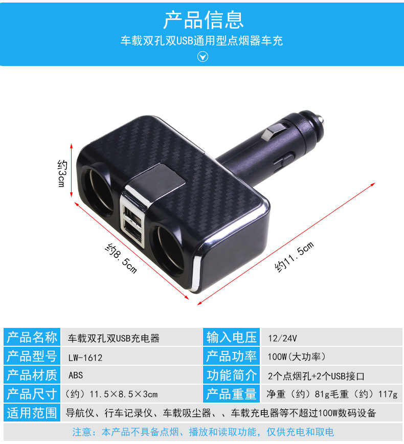 【注意事项】:本产品为连体式插座,购买前需确认您的的车子点烟孔位是否合适;使用电器总功率请勿超过100W;请勿在高温或者是潮湿的环境下使用本品;请勿强烈撞击本品。不可直接用于点烟、播放和读取功能!只用于取电分电!
