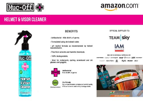 Studio : Muc-Off Publisher : Muc-Off Binding : Automotive Product Description * Removes dirt, dust, grime, snow, sweat, and oily residue from helmets, eyewear, and goggles * Antibacterial - Kills 99.9% of germs * Formulated using de-ionized water * pH neutral formula as recommended by helmet manufacturers * Free from solvents and harmful chemicals * 100% biodegradable 0