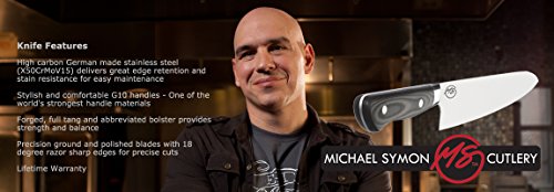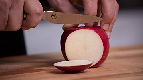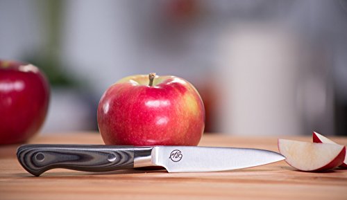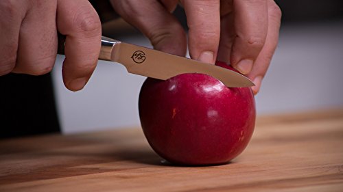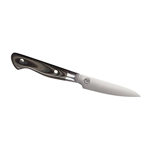 Michael Symon's 3.5 inch paring knife is designed for small peeling, garnishing and slicing of fruits and veggies. The sturdy blade is .068 inches thick by .780 inches wide by 3.5 inches long allowing you to cut smoothly through veggies with ease. The handle is .670 inches thick by .800 inches wide in the middle by 3.950 inches long including the bolster. Two polished rivets in the handle complete the look. The blade is precision tapered with 18 degree sharp edge. A high polish finish for beauty, smooth cutting and less food stick. We make sure each knife is heat treated to the best hardness ensuring long edge life and easy maintenance for both the busy chef and home cook.