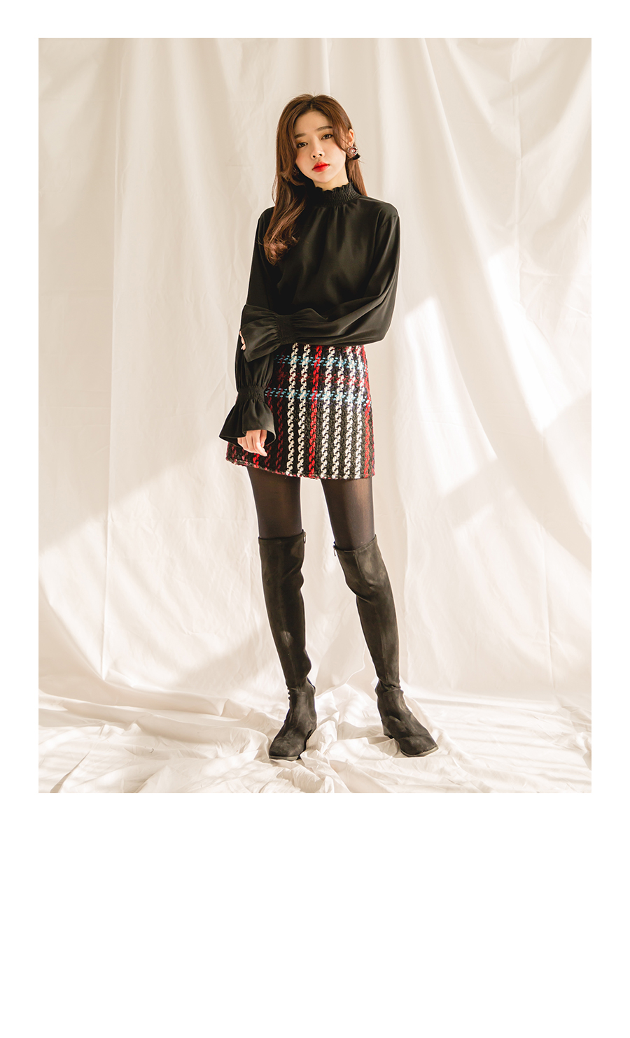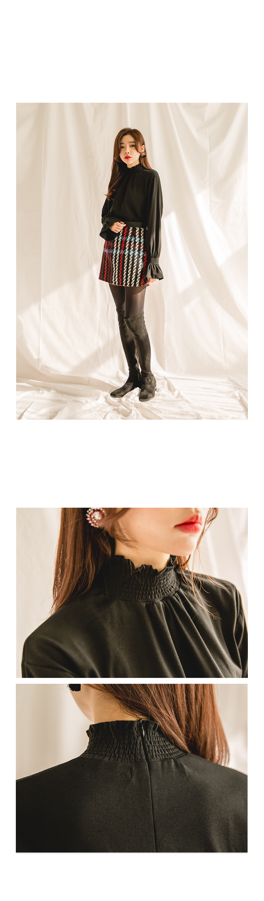 넥라인을 따라 셔링라인이 자연스럽게 연출되어 볼륨있게 연출되었어요