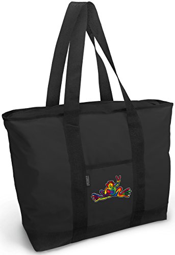 Product Description Sturdy yet lightweight, this deluxe Peace Frogs tote bag is great for a day of shopping or an overnight visit. This carry-all Peace Frog tote bag is made of super strong 600 Denier fabric. Measuring 16.5 x 15 x 5, the Broad Bay Peace Frogs tote is a spacious Peace Frogs tote bag with a wide zipper top opening, a small zippered interior compartment for coins and your phone, an exterior slip pocket, and a reinforced bottom. You will love this everyday carry-all Peace Frogs tote bag! The Broad Bay Peace Frogs tote bag is a great Peace Frogs gift! 0