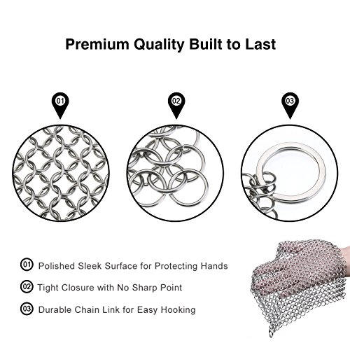 -. Feature : 8x8 INCH LARGE SIZE: XXL 8X8 inch iron cleaner is larger than other similar products in the market. If you have bought any cast iron scrubbers before, you may be disappointed by its small size which cost a lot of effort to clean. This Pictek Cast Iron Cleaner allow you to clean effortlessly and quickly, saves your time. / UPGRADED CRAF: The hand made chainmail design means that only the round ring edges touch the pan to clean stubborn stains thoroughly without any scratch. And every ring is linked together and closely completely, without worry of falling off. / QUALITY MATERIAL: Handcrafted rings made from the highest grade 304L stainless steel- the highest food grade steel in the industry, will never rust for its entire life. We adopt superior steel at the same time improve technological process to lower the cost to provide a high quality and inexpensive product for you. / KITCHEN ESSENTIAL: Stainless steel scrubber is a good helper for your kitchen life because it can wipe off solid residues or grime effortlessly without damaging the cookware and be easily cleaned. This especial scrubber is designed for cleaning many kinds of cookwares such as cast iron, glassware, stainless steel, a pizza stone, plates, baking sheets and more. / REST ASSURED PURCHASE: Have passed FDA & ROHS CERTIFICATION! WARRANTY: Lifetime after sale service; 30 days money back guaranty & one year warranty. Solve all your buying issues with satisfaction