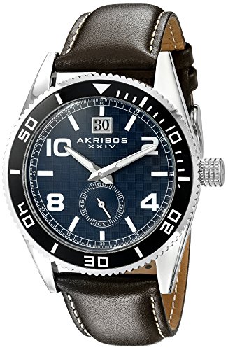 Studio : TWI Watches, LLC Publisher : TWI Watches, LLC Binding : Watch Product Description A true marvel of modern design, this AKRIBOS XXIV Men's timepiece features a distinctive 44mm case design with brushed finish and unidirectional ratcheting bezel. The fascinating blue dial has a checkered pattern that dazzles the eye, and the hands and numerals are luminous. The highly accurate and reliable Miyota quartz movement is well protected by 3ATM water resistance. This timepiece is completed with a smooth brown genuine leather strap. 0