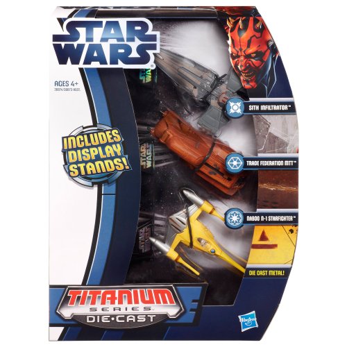 -. Binding : Toy -. Brand : Hasbro -. EAN : 0653569704904 -. Feature : The SITH INFILTRATOR vehicle is just like the fearsome DARTH MAUL character's personal starship. / Each vehicle comes with its own battle stand, so these vehicles look awesome whether you send them into "combat" or stand them up in your collection / 3-pack of die-cast TITANIUM SERIES vehicles has NABOO N-1 STARFIGHTER, TRADE FEDERATION MTT and SITH INFILTRATOR vehicles from Episode I of the Star Wars epic! / Set the vehicles on their display stands. / Pack includes 3 die-cast vehicles and 3 display stands. -. Label : Hasbro -. LegalDisclaimer : Ages 4 + -. Manufacturer : Hasbro -. Model : 38874 -. MPN : 38874 -. PackageQuantity : 1 -. PartNumber : 38874 -. ProductGroup : Toy -. ProductTypeName : TOYS_AND_GAMES -. Publisher : Hasbro -. ReleaseDate : 2012-01-30 -. Studio : Hasbro -. Title : Star Wars Die Cast Titanium Vehicle - Sith Infiltrator, Trade Federation MTT, Naboo N-1 Starfighter -. UPC : 653569704904 -. Warranty : 1 year warranty against manufacturer defects