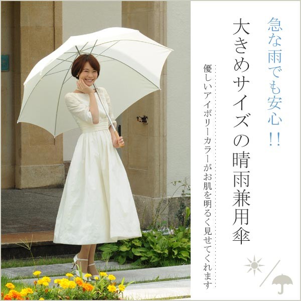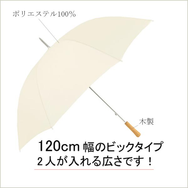 【ウェディングにぜひ、” 2人が入れる大きめサイズのアンブレラです! ”】ベーシックな定番の形で、大きめサイズの傘です。野外のウェディングでの雨に備えてもご準備いただくと安心です。 おしゃれでぬくもりを感じさせてくれる木の持ち手がすっきりまとめてくれます。とことんシンプルにまとめたデザインがシーンを選ばず、使いやすい傘です。(ウェディング・フォトにもお使いいただけます)カラーは落ち着いたテイストのアイボリーカラー。日差しを遮りつつも、光を受けてやさしい明かるさが、花嫁様のお顔をやわらかく彩ってくれます。【検索キーワード】ウェディングドレス/ウエディングドレス/白ドレス/マリッジ/ブライダル/ガーデンウェディング/フォトウエディング/花嫁/新婦/ブライズ/挙式/結婚式/披露宴/パーティ/パーティー/チャペル/教会/人前式/セレモニー/海外/リゾート/ホテル/式場/2次会/1.5次会/前撮り/アクセサリー/ヘアアクセ/ウエディング小物/ウェディング小物/Wedding/Bridal/ギフト/プレゼント/贈り物/花/フラワー