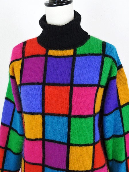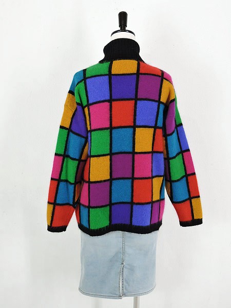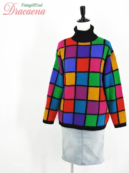 カラフルなブロック柄のタートルネックニットです。