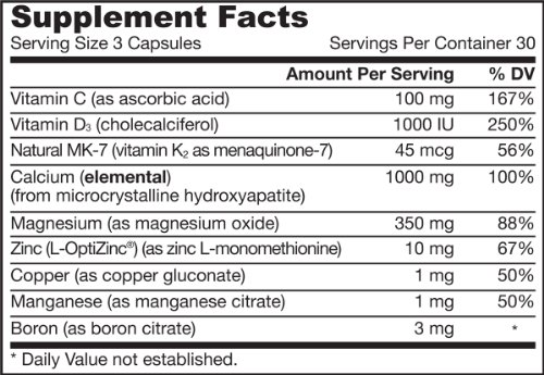 Promotes Bone Density.Suggested usage:Take 1 capsule 3 times per day with meals, (for a total of 3) to facilitate maximum absorption, or as directed by your qualified healthcare professional