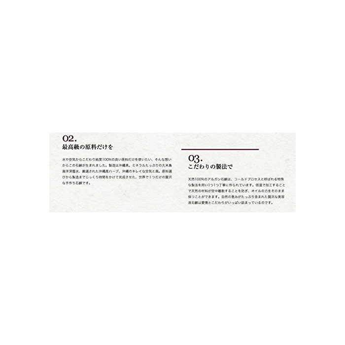 영양,보습력에 풍부한 argand 오일을 호화에 사용.한층 더 미네랄 충분히 구메지마 해어 심층수,엄선 된 오키나와산 허브를 사용해,수나 공기 등의 환경에까지 구애되어 오키나와에서 하나하나 정중하게 수작업으로 제조되어 있습니다.