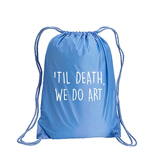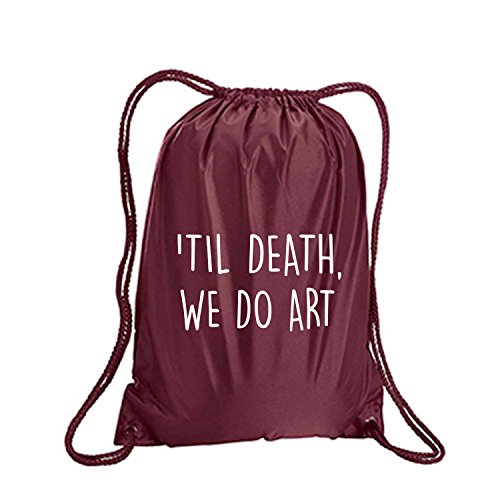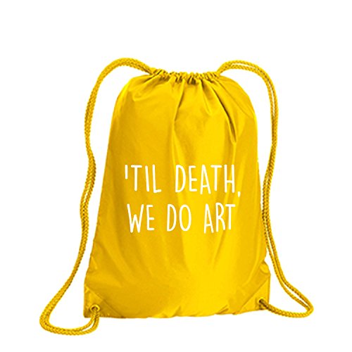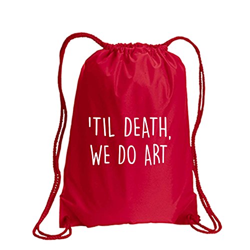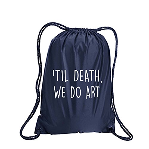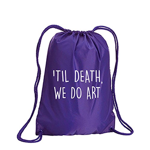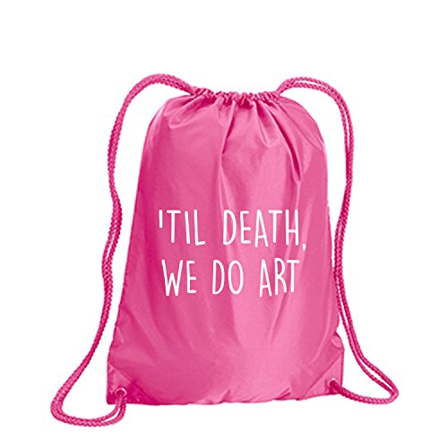 Product Description This durable and stylish nylon tote features "'Til Death, We Do Art" on a cinch pack tote with white ink. Bag comes in small and large sizes and is made of a durable 210 Denier nylon and has color-matched draw cords. Printed in the USA on an imported bag. 0