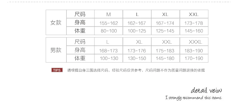 男装:L码,XL码,XXL码 。 女装:M码,L码,XL码 |
