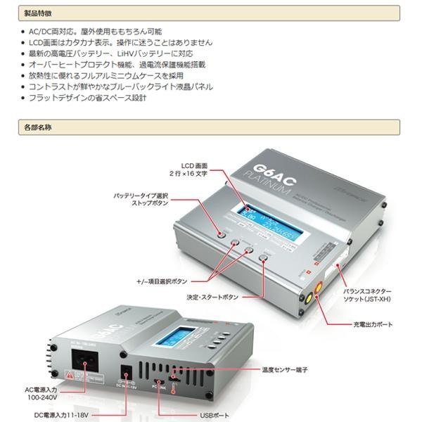 | セット内容 | G6AC PLATINUM本体 DC入力ケーブル AC入力ケーブル タミヤタイプ コネクタ 2ピンコネクタ(ディーンズタイプ) タミヤLiFe変換コネクタ 日本語取扱説明書 |
