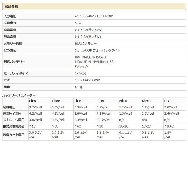 | 仕様 | 入力電圧:AC100-240V/DC11-18V 充電出力:50W 充電電流:0.1-6.0A(最大50W) 放電電流:0.1-2.0A(最大5W) メモリー機能:最大10メモリー LCD表示:2行×16文字 ブルーバックライト |