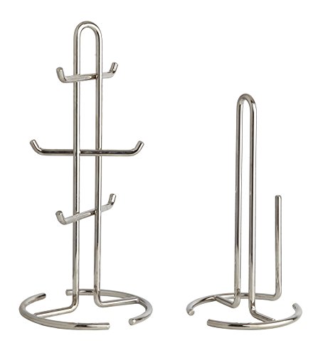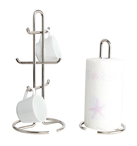 Finnhomy Heavy Duty 2 PK Set Paper Tower and 6 Coffee Cup Holder Mug Tree Rack Toilet Roll Organizer Weighted Stand and Base Glass Storage Drying Hanger Countertop Kitchen Accessories Chrome Finish
