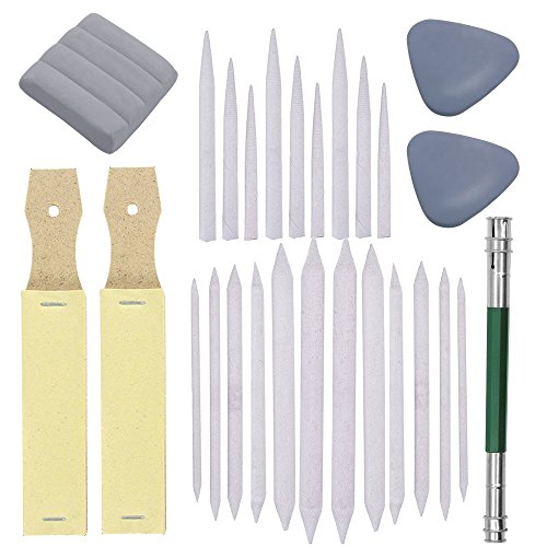 - Package includes: 12pieces blending stumps, 9pieces tortillions, 2pieces sandpaper sharpen pads blocks;1pieces pencil extension tool, 1pieces kneaded Erasers And 2pieces Gloss Erasers.