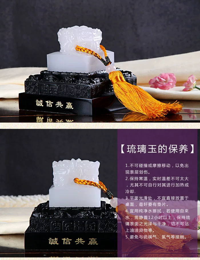 产品介绍: 琉璃玉是琉璃的一种,不属于玉,只是代表此种琉璃比较通透,像玉一样精美。琉璃,亦作"瑠璃",是指用各种颜色的人造水晶(含24%的二氧化铅)为原料,采用古代青铜脱蜡铸造法高温脱蜡而成的水晶作品。其色彩流云漓彩、美轮美焕;其品质晶莹剔透、光彩夺目。这个过程需经过数十道手工精心操作方能完成,稍有疏忽即可造成失败或瑕疵。 琉璃的顔色:是制作原料的天然顔色,不是添加的色素,琉璃的顔色非塗非抹非鍍,完全是跟材質合二爲一,融爲一體的,所以不會褪色。 琉璃是佛教"七宝"之一、"中国五大名器"之首。采用彩色人造水晶烧制而成,其工艺繁复,需数十道工序,且以手工为主。因其"火里来,水里去"的工艺特点,佛教认为琉璃是千年修行的境界化身。在所有经典中,都将"形神如琉璃"视为是佛家修养的最高境界。琉璃在佛教中为消病避邪之灵物。 【琉璃有哪些功效】 摆放琉璃圣物,可得四种福缘: 1. 祛病:使人获得健康之福缘; 2. 坚韧:因烧制繁难,佛教认为琉璃能使人感受提炼真理之艰难,而获坚韧之力量; 3. 灵感:绚丽色彩给人带来艺术美感和想象空间,给予灵感与智慧; 4. 趋吉避凶:丰富的能量对于供佛、辟邪、镇宅有趋吉避凶、安定情绪之效,代表着如意美满、吉祥富贵。 琉璃属于价值不菲的艺术品,原因有二:其一,古法琉璃材料特殊,而且其制作工艺相当复杂,火里来、水里去,要几十道工序才能完成,有的光制作过程就要十到二十天,且主要依靠手工。各个环节的把握相当困难,其火候把握之难更可以说是一半靠技艺一半凭运气。仅出炉一项,成品率就只有70%。更关键的是,古法琉璃不可回收,也就是说一旦出现一点点问题,十数天、几十道工序,多少人的努力就立刻付诸东流。其二,琉璃不仅仅是一种材质,更是一种文化产品,更重要的是,琉璃产品是独一无二的,没有两个一模一样的琉璃产品。 【琉璃的制作】 1、制作工序冗长:从构思、设计、雕塑、烧制、细修、打磨至作品完成,需经过四十七道精致烦琐的手工工序才能完成。 2、手工制作:工人必须掌握精湛技术方能操作,每道工艺均有各自不定的变化因素,且在工艺过程中需经反复实验,作品色彩无一雷同,制作难度极高。 3、一模一品:一只模具只能烧制一件作品,无法二次使用,大型复杂作品甚至需要多次开模、烧制才能完成。低成功率,使作品更为可贵可珍。 4、高温烧制:将精选原料以1400℃以上高温熔制成各种彩色水晶玻璃,并经过多次精选清洗后,按作品用料比例置于模具中,并设定严格的升、降温曲线,炉温必须控制在1000℃±5℃以内。烧制过程长达15天以上,使水晶原料,精确到每个细微处。方可确保作品精细奇巧、立体、真实、流线飘逸、清晰。 5、琉璃内的颜色都是由各种金属氧化物高温烧结而成的,不会有褪色、氧化等老化现象的出现。 6、琉璃的气泡:琉璃作品应具有艺术生命力,存在于作品中的气泡, 更具想象空间,更具灵气。 气泡是琉璃的呼吸,这是琉璃艺术领域的共识。 琉璃内,或大或小、或浮或沉的气泡,是琉璃生命的特征。这些气泡游走于晶莹剔透的水晶之中,漂浮于柔情似水的颜色带之间。琉璃作品的制作工艺为琉璃脱蜡铸造法,手工精制。作品的颜色流动及气泡效果均是自然生成,故每件作品皆为独一无二。这是琉璃脱蜡铸造的工艺特色,也是作品收藏价值之所在。 【琉璃的养护】 (1)不可碰撞或摩擦移动,以免出现表层划伤。 (2)保持常温,实时温差不可太大,尤其不可自行对其进行加热或冷却。 (3)平面光滑处,不宜直接放置于桌面,最好要有垫片。 (4)宜用纯净水擦拭,若使用自来水,需静置12小时以上,保持琉璃表面之光泽与干净,切不可沾上油渍异物等。 (5)避免与硫磺气、氯气等接触。