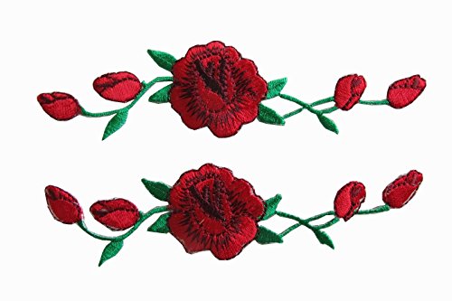 2 Pcs Applique Patch Rose Flower Embroidery Iron On Flower Appliques For Craft, Sewing, Clothing, Scrapbooking Decorative 1 1/8"x4 3/4" inch (Red)