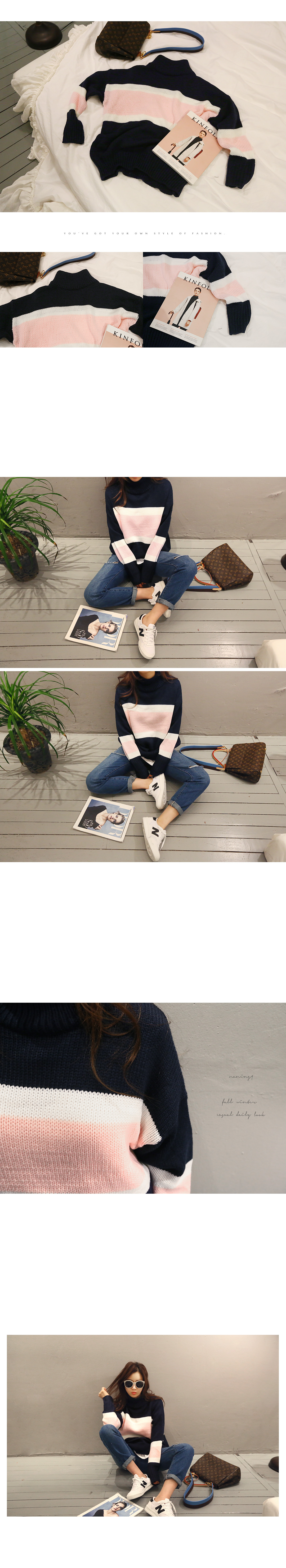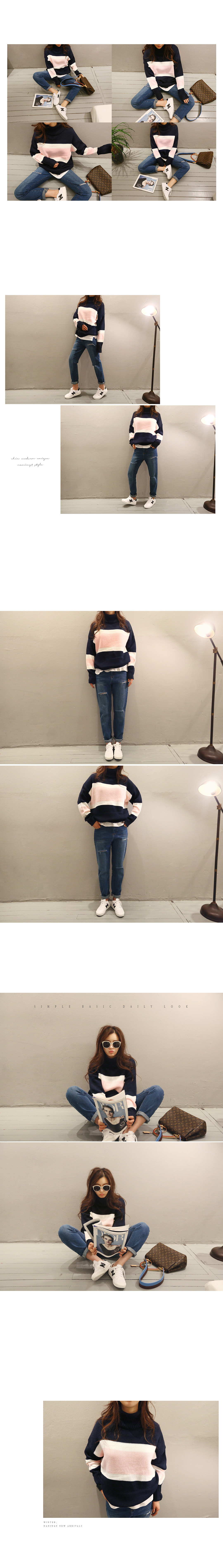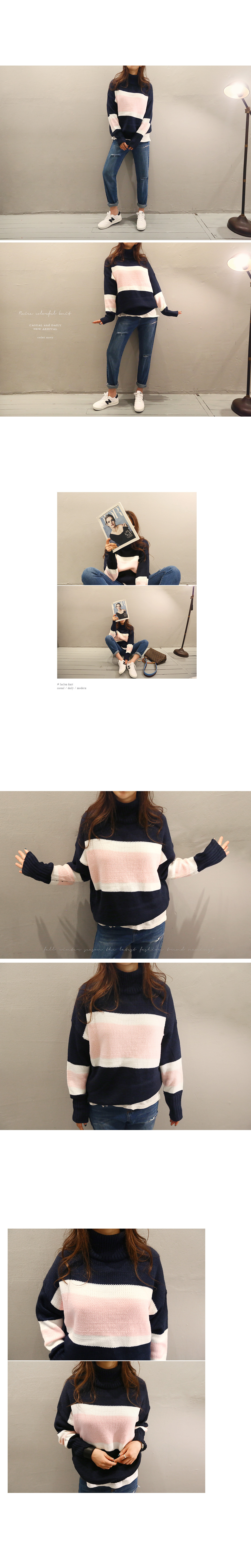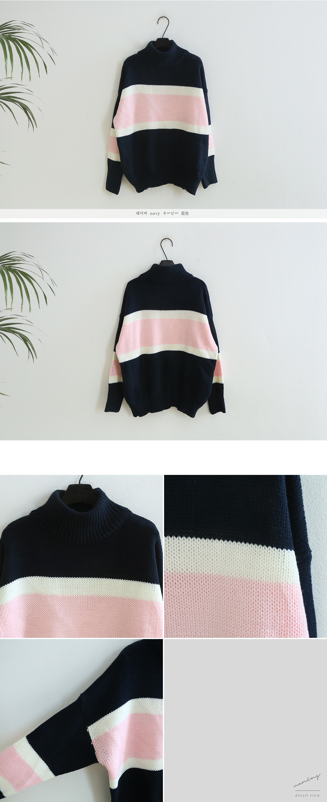네이비와 핑크 컬러가 예쁜 배색 조합을 보여주는 니트에요!
