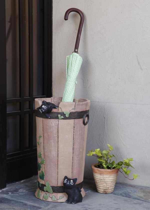 バーレル型の傘立ては、クロネコ達のお気に入りの遊び場。受け皿付きの傘立てです。