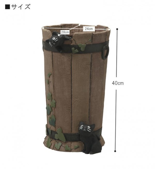 fk094igrjsバーレル型の傘立ては、クロネコ達のお気に入りの遊び場。受け皿付きの傘立てです。 製造国:中国 素材・材質:レジン 商品サイズ:24W(上部タル部分)×28L(上部ネコ含む)×40Hcm 重量:4kg 仕様:受け皿付き※お届け地域により、別途運賃がかかる場合やお届けできない場合がございますので、お問い合わせ下さい。