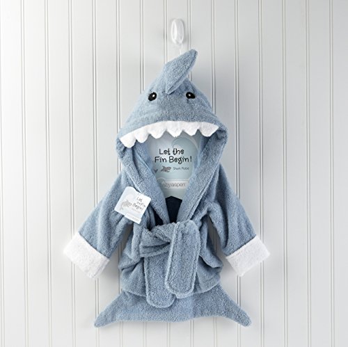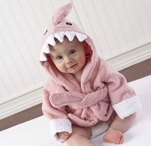 -. Feature : Personalized with baby's name (up to 15 Characters) on the shark's tail / Ligt pink terry robe with white cuffs, two terry ties in front, a hood with smiling, white shark's teeth, appliqued black eyes and a dorsal fin accent / Bottom of robe resembles a shark's tail / A Baby Aspen label at the collar, the Baby Aspen hanger and the quality of materials used are indicators of an authentic Baby Aspen robe. / 100% Cotton Terry, Size 0-9 Months, Machine Washable