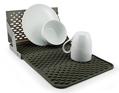 -. Feature : 10.4" x 15.7" size. Folds for easy storage / Non slip surface holds securely to countertop / Raised pattern elevates items for optimal aeration and drying / Doubles as a trivet for hot dishes. Heat resistant to 500 degrees / Dishwasher safe