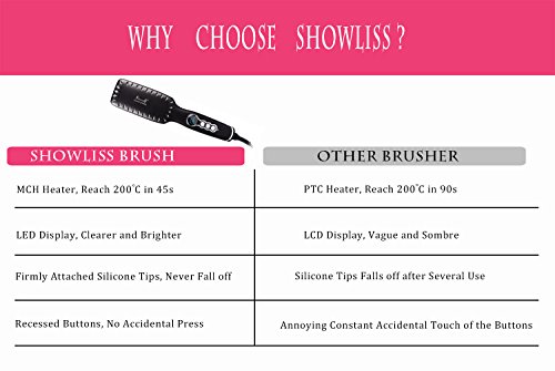 Showliss LED Hair Straightening Brush aims to detangle hair knots, transform dull drab hair into smooth hair, eliminate frizz, hair loss and removes hair static. NEWEST GENERATION OF HAIR STRAIGHTENER--Save your time and money wasted at salons on professional hair straightening treatments.This hair straightening brush applies powerful MCH Heating system, heating up in less than 1 minute,saving energy, more durable, and lasts longer.