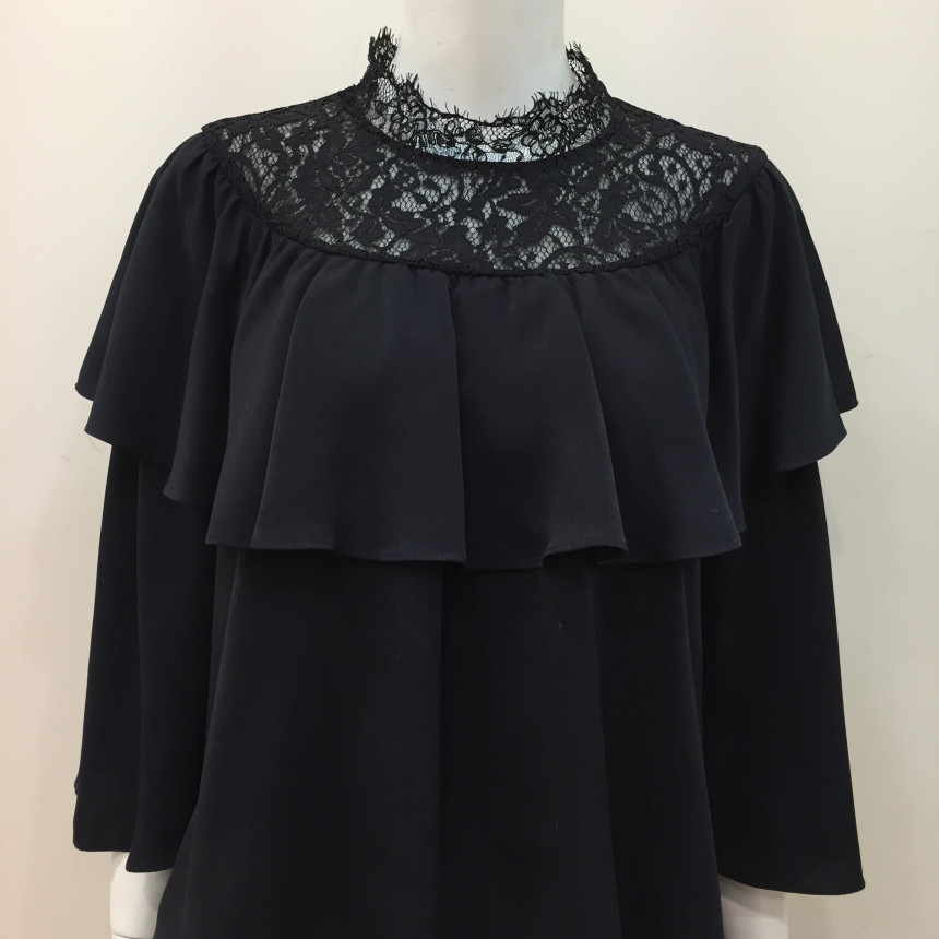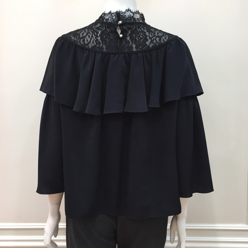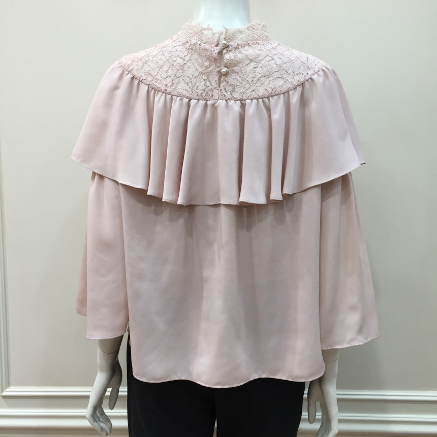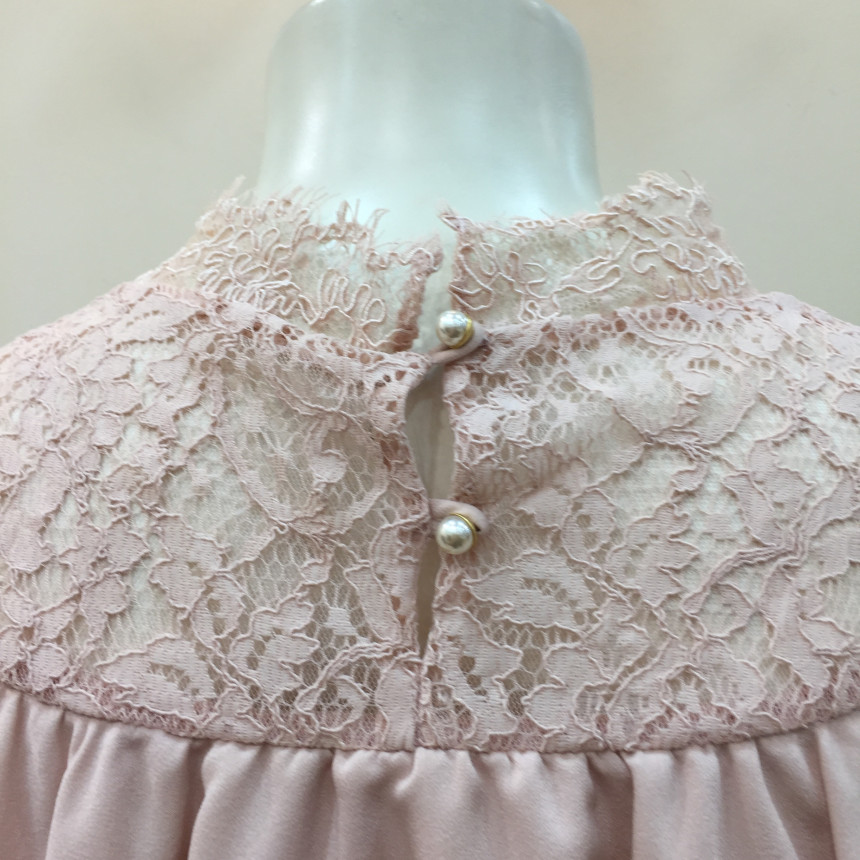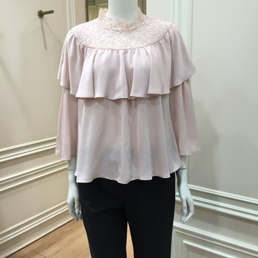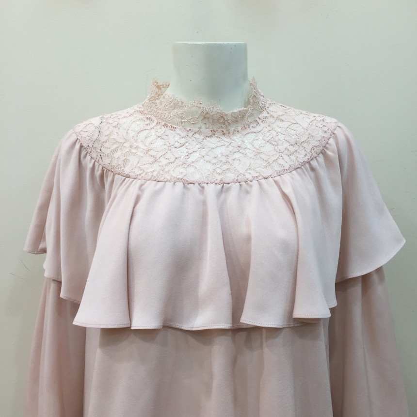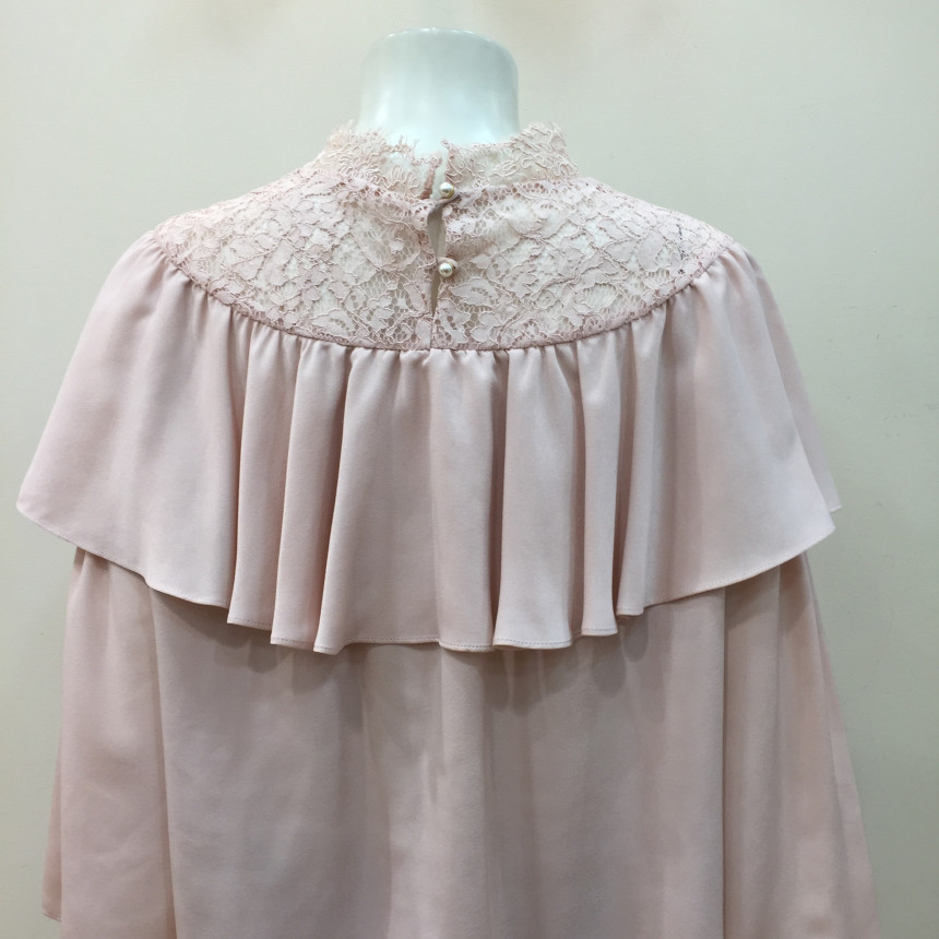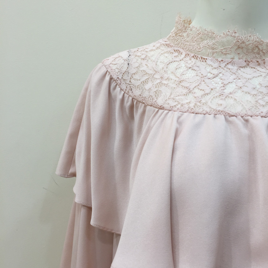 레이스 원단을 요크에 배색으로 사용했으며 짧은 기장감에 러플로 디테일을 주었습니다.