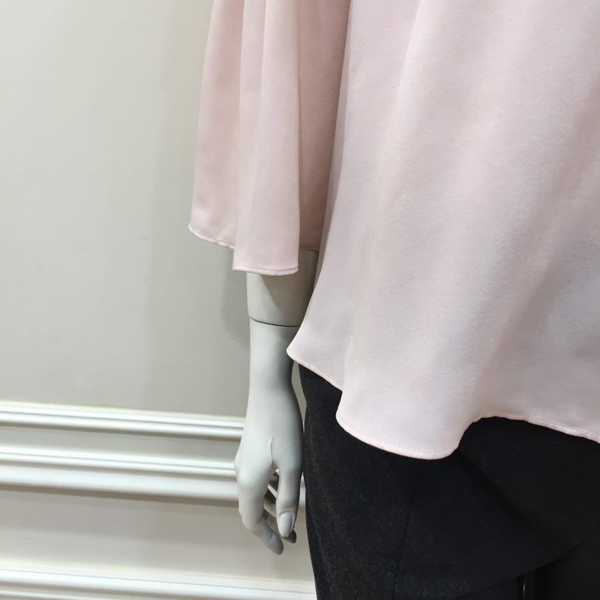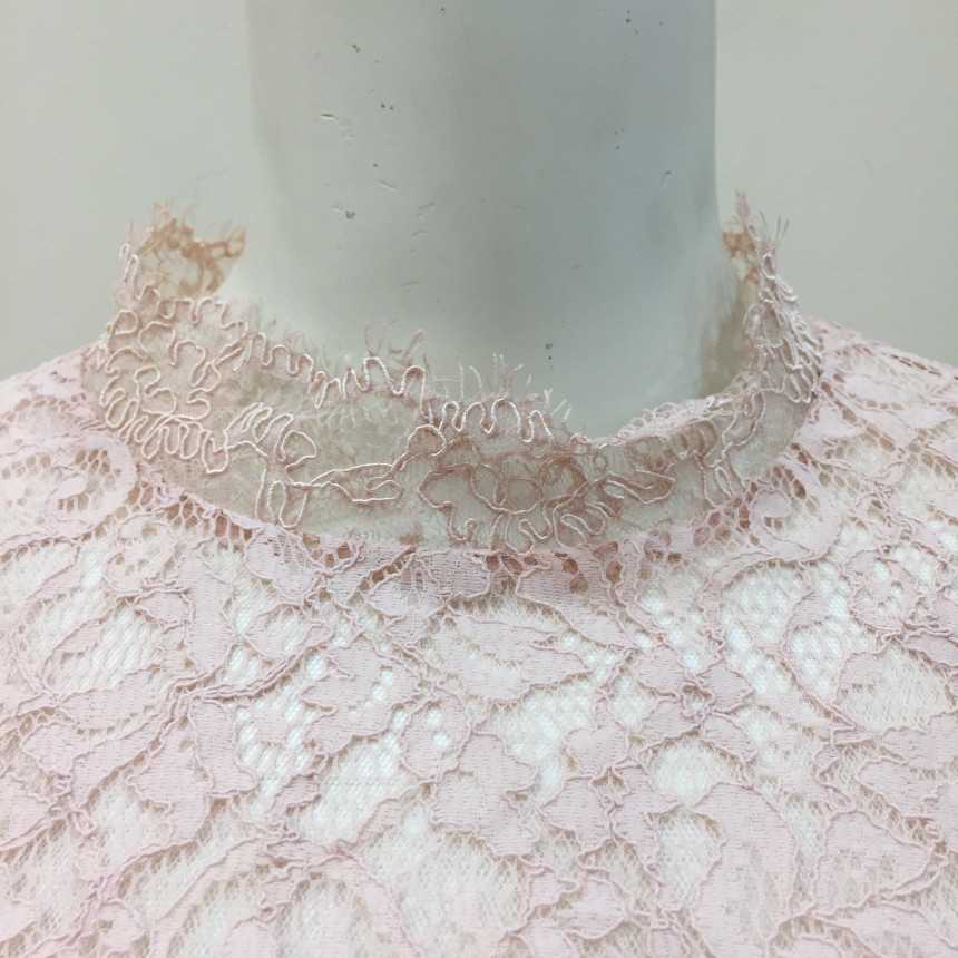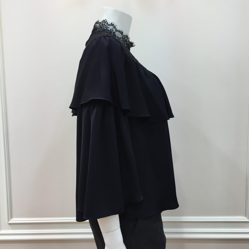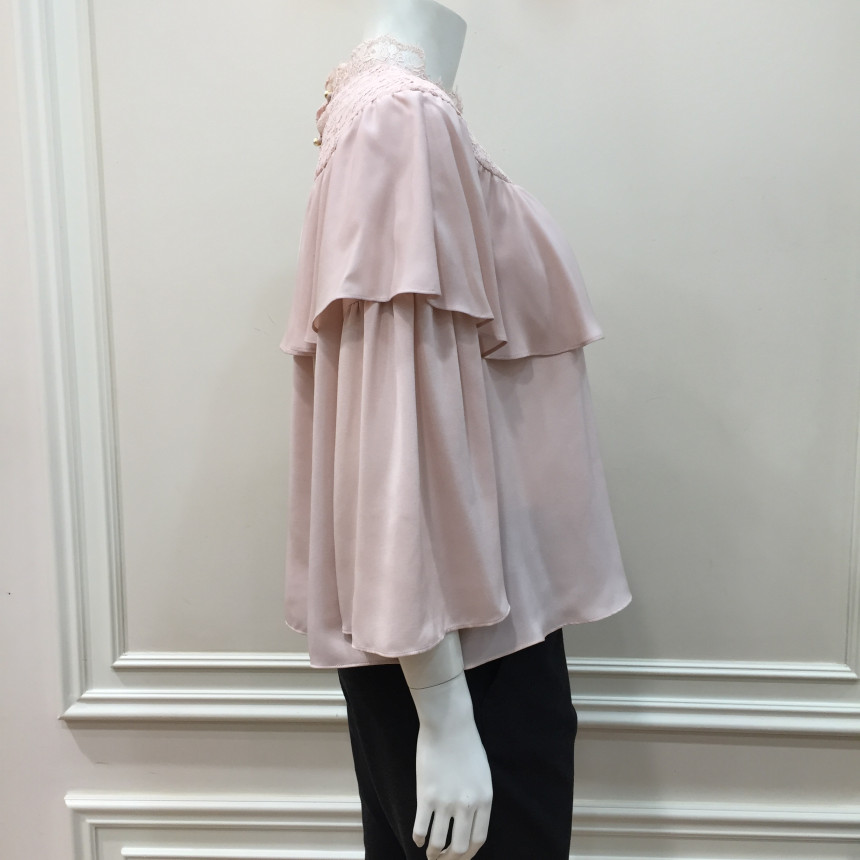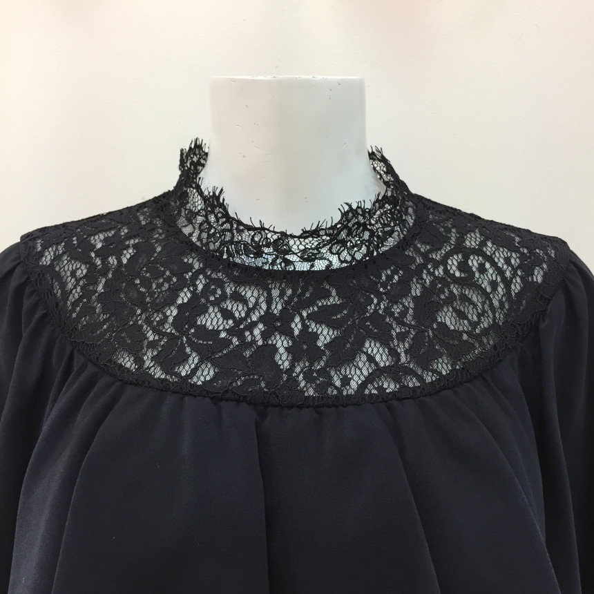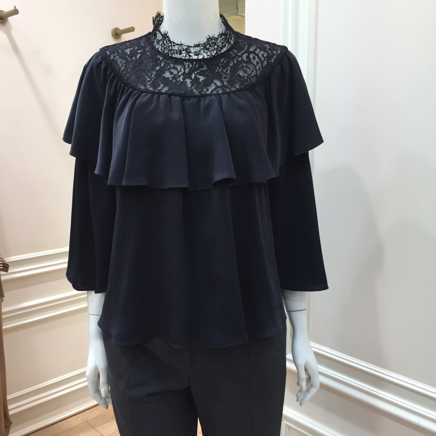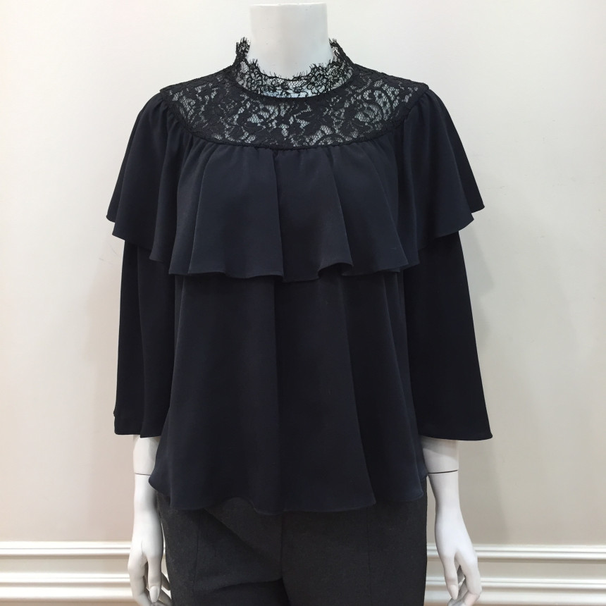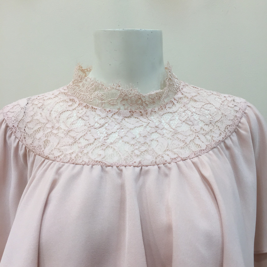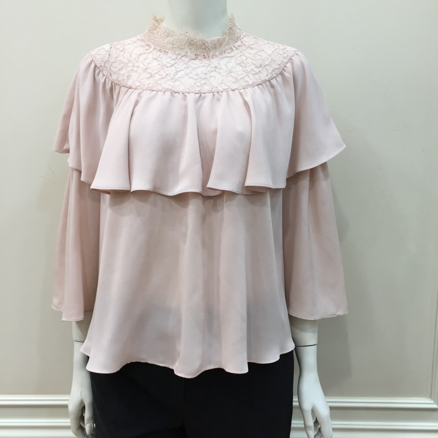 레이스 원단을 요크에 배색으로 사용했으며 짧은 기장감에 러플로 디테일을 주었습니다.