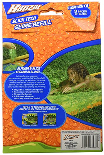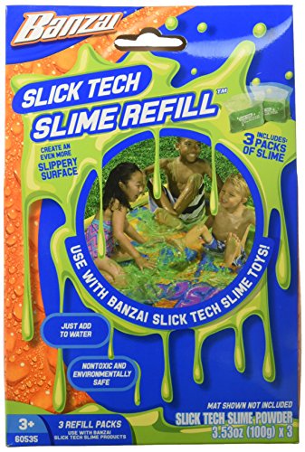 Get ready for some ooey-gooey summertime slimy fun with the Slip Tech Slime Mix! A little goes a long way! Just add a little of this nontoxic powder to water and mix thoroughly. As the powder dissolves, you’ll feel it expand and get more and more slimy. You’ll be slithering and splashing all summer long! Refill to add more goo to our Banzai Slip Tech Slime products.Feature