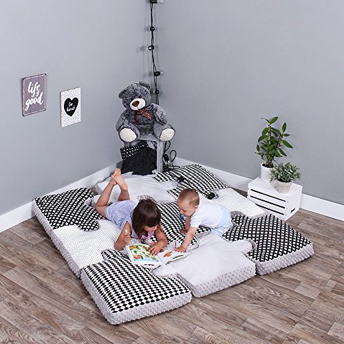 Studio : LULANDO Publisher : LULANDO Binding : Baby Product Product Description Puzzle Pillows ? Set dimension - 9 pcs: 145cm x 145cm x 9cm ( /- 2cm) Pillow dimension: 48cm x 48cm x 9cm Puzzle pillows set which makes a fantastic baby play mat. Our set is not only a great toy but also original decoration for every nursery. We used vide range of textiles, designs and colours, so that your little one develops creativity, imagination and perceptiveness while having a great fun. Pillows are soft and fully safe, there are no sharp elements. Made of 100% cotton (top and bottom) and soft plush polar MINKY (sides). Filled with anti-allergic polyester fibre, keeping the pillow soft, fluffy and resilient. We use only certified fabrics with Oeko tex standard 100 and exceed the strict human ecology requirements for products which have contact with delicate baby skin. It is a guarantee of quality and safety. Made in EU Composition: Cover: 100% cotton, 100% polyester Filling: 100% anti-allergic polyester ? Care instructions: Machine washable 30 °C Ironing 110°C - only cotton cover Max. 800 spins 0