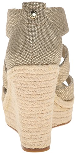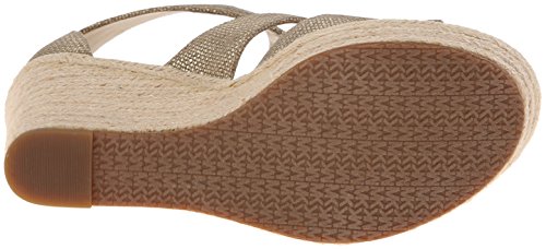 - Leather or canvas upper in an espadrille wedge sandal style with a round, open toe