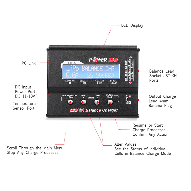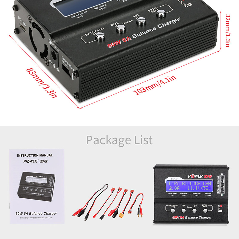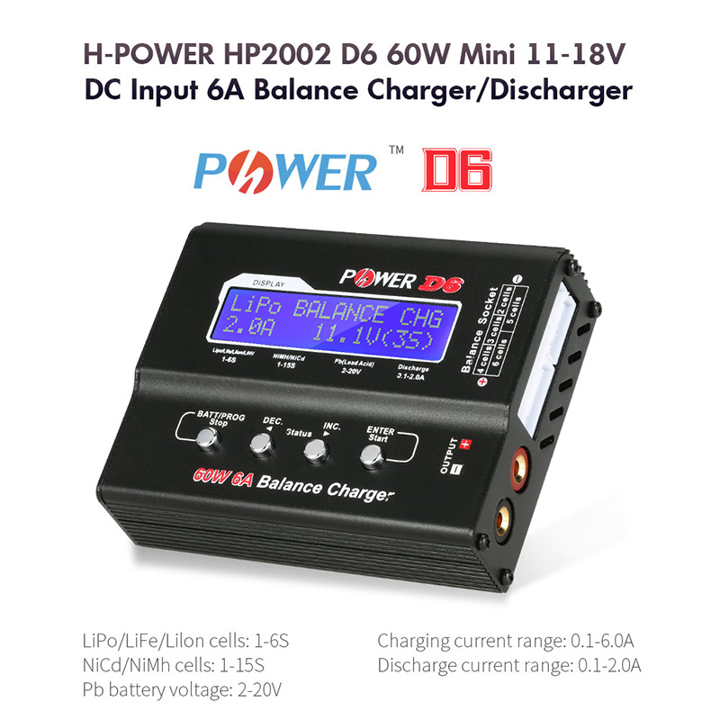 H-POWER HP2002 D6 charger is an economic, high quality 11-18V DC balance charger, designed for charging LiPo LiFe Lilon NiCd NiMh Pb batteries, The circuit power is 60W and max charge current can reach at 6A.