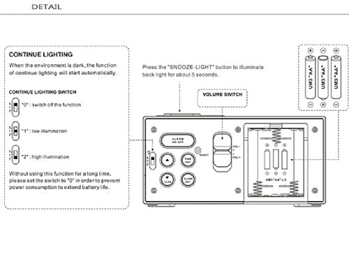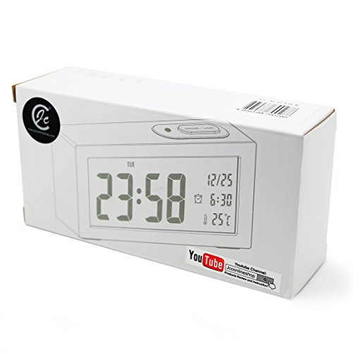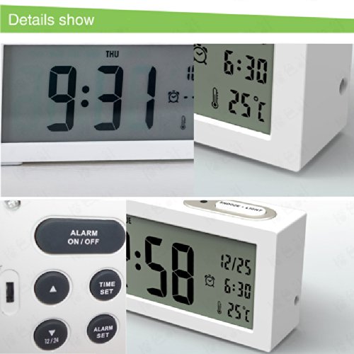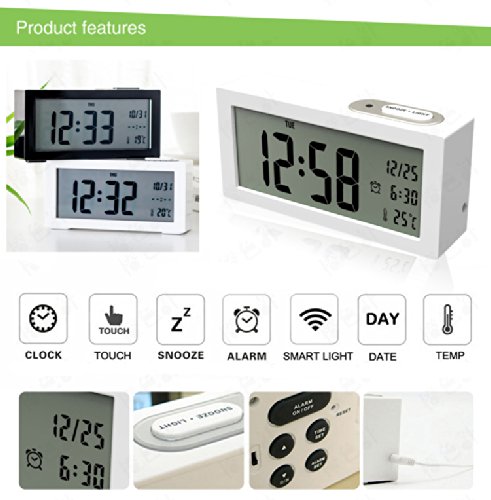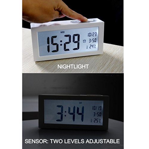 - Feature : Multifunction 4 in 1: clock, alarm clock, thermometer, calendar. / Large display and big numbers. Time (12/24), Calendar (MM/DD), Temperature(°C), Alarm Time . / light-activated mode: Turn On Sensor, back light automatically comes on when it's dark around. It's soft (brightness is normal backlight 25%), making you sleep easily or see time from a distance hands free. It can also be closed. If bright light needed, please Press light button to use nightlight, which lasts 6 seconds. / Two Auto Back light illumination selectable; Two Alarm Volume Selectable / Snooze function: repeats every 5 minutes (Touch the top button)