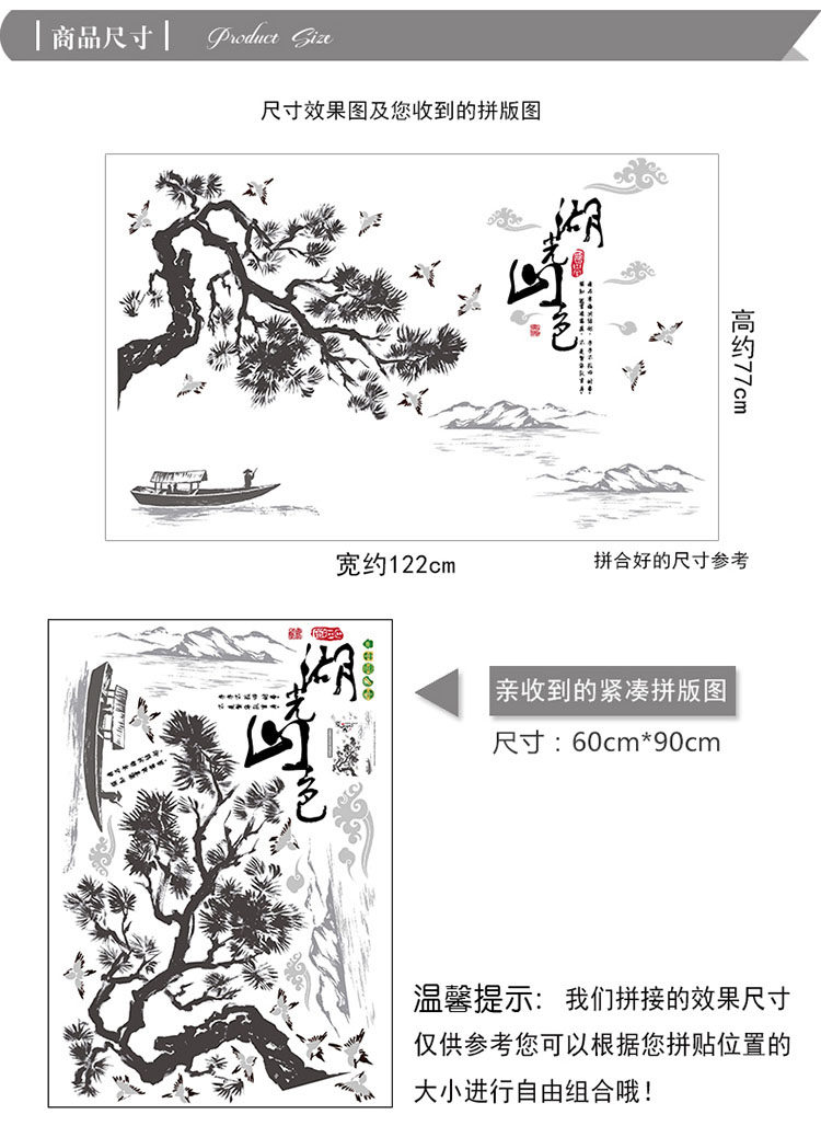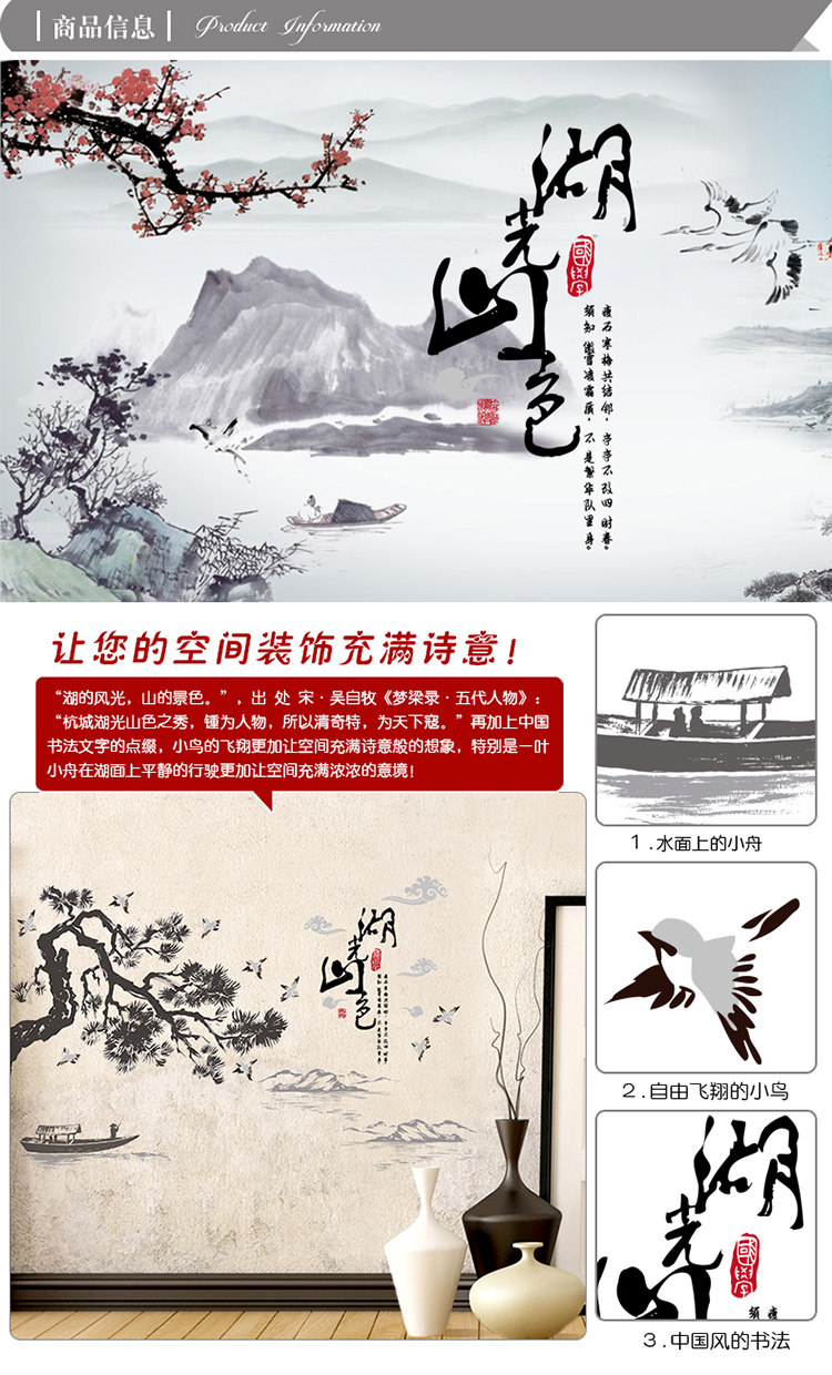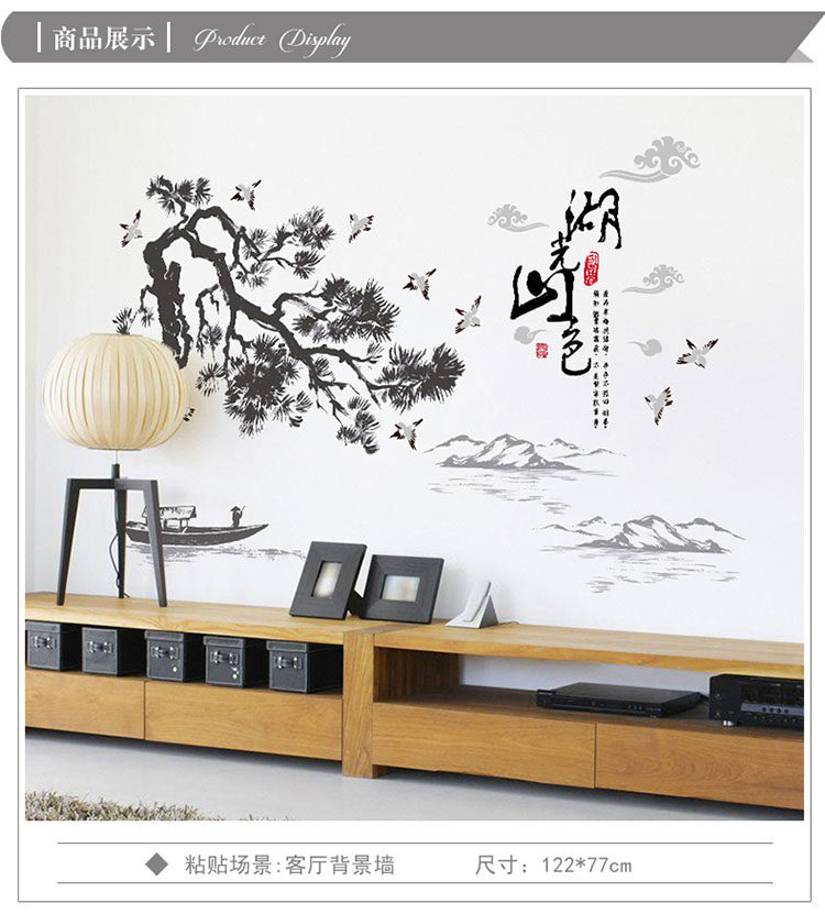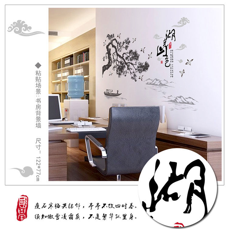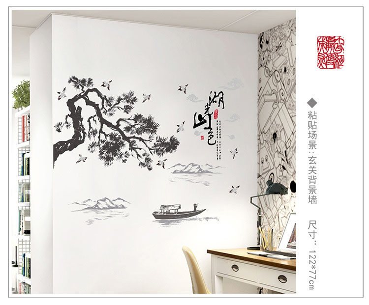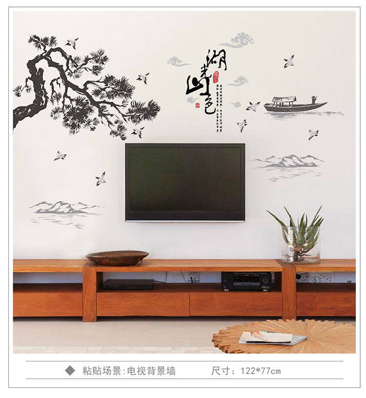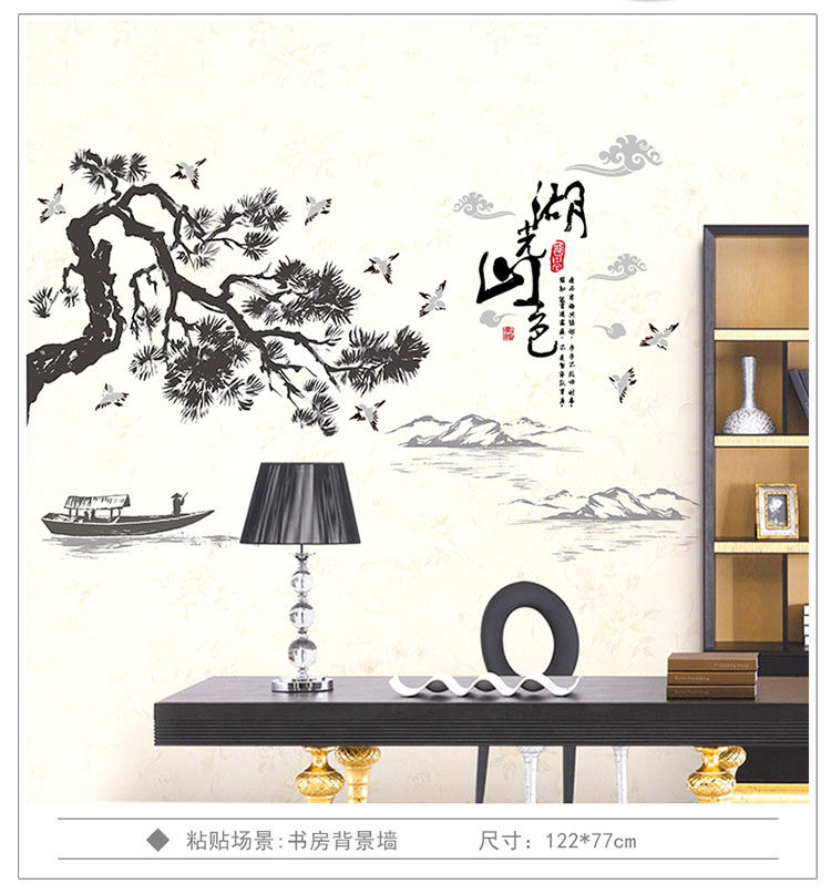 墙贴 中国风黑白山水湖光山色贴纸 客厅电视墙背景装饰品书房布置