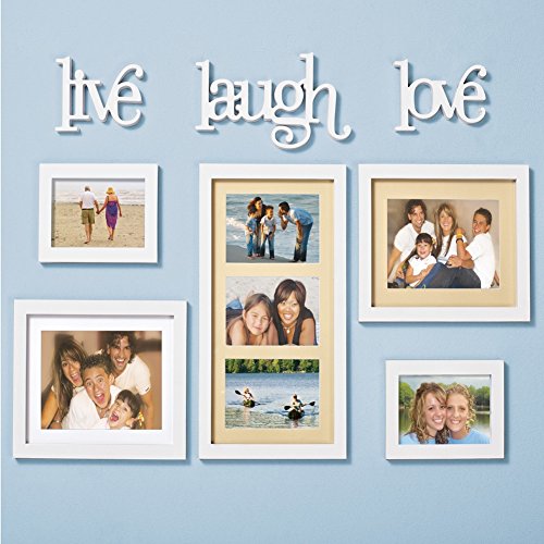 -. Binding : Kitchen -. Brand : Collections Etc -. EAN : 0842022180489 -. Feature : Arrange this 8-piece set however you please to showcase your favorite photos anywhere in the house / Set includes 5 different frames that hold 5" x 7" and 4" x 6" photos / Also includes the inspirational words, "Live, Laugh and Love" / Each piece has hooks on the back for easy hanging / Words measure approximately 5"H, largest frame is 8 1/2"L x 14 3/4"H -. Label : Collections Etc -. Manufacturer : Collections Etc -. MPN : 34707 -. PackageQuantity : 1 -. PartNumber : 34707 -. ProductGroup : Home -. ProductTypeName : HOME -. Publisher : Collections Etc -. Studio : Collections Etc -. Title : Photo Frame Wall Gallery Set - 8 pc -. UPC : 842022180489