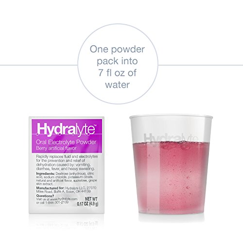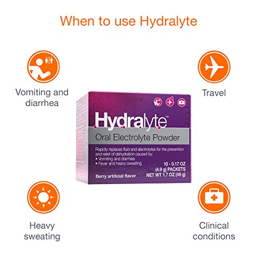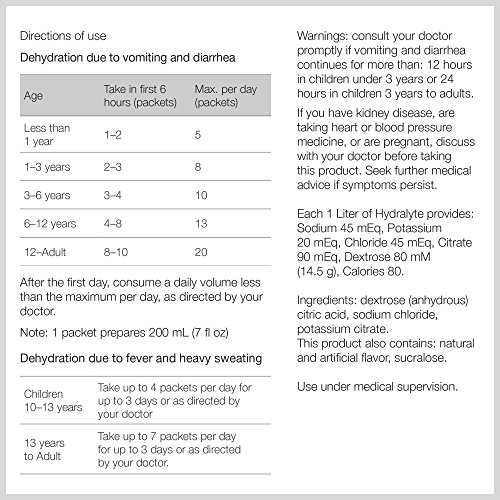 -. Binding : Health and Beauty -. Brand : Hydralyte -. Feature : EASY MEASUREMENT FOR THE RIGHT DOSING: Packed with a measuring cup to allow for accurate dosing. / COMPACT AND PORTABLE: The container makes it portable for travel and on the go. Ideal for first aid kits and travel bags. / PERFECT HYDRATION SOLUTION FOR ACTIVE PEOPLE:Hydralyte may also be taken to help manage dehydration due to the loss of fluids through heavy sweating. This can be caused by fever, endurance exercise, prolonged heat exposure or prolonged physical work. / IDEAL FOR FAMILIES WITH VOMITING AND DIARRHEA:TIP: When administering Hydralyte Ready to use Electrolyte solution to babies and infants, pour Hydralyte directly into a sterilized baby bottle or sippy cup. Alternatively, use a small dosage syringe to administer the solution directly into the mouth. / MORE EFFECTIVE THAN SUGARY DRINKS: Water or sugary drinks (i.e. soda or standard sports drinks) are not as effective as Hydralyte, as they do not adE.q.u.a.t.ely restore lost electrolytes (which retain the fluid). Sports drinks also contain a lot of sugar (approximately 4 times the amount compared with Hydralyte!) - Excess sugar can cause bloating and impede the hydration process. -. Label : Hydralyte -. Manufacturer : Hydralyte -. ProductGroup : Health and Beauty -. ProductTypeName : HEALTH_PERSONAL_CARE -. Publisher : Hydralyte -. Studio : Hydralyte -. Title : Hydralyte - Oral Electrolyte Powder, On-the-go Hydration Formula (10 Count)