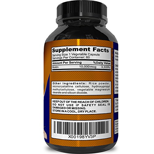 Biotin is everyone's favorite "secret weapon" for inside-out beauty enhancement. Thicker nails, shinier longer hair, glowing skin-Biotin supplements have got it covered. Biotin is actually Vitamin B7, and is sometimes known as "Vitamin H" for "hair." It's a vital nutrient for beauty and will definitely get you noticed. An unmistakable luster and thickness will reflect light, resulting in super shiny hair. But, Biotin is not only about looks. It's an essential vitamin necessary for the metabolism of fats, protein and carbs. It supports the health of the liver, eyes and nervous system. It helps maintain healthy weight, blood sugar levels, cholesterol levels, muscle and tissue repair. It also revitalizes dull skin and hair, and delivering glucose to cells to convert sugars to useable fuel and energy. Biotin is often used for: -Raising metabolism -Losing weight -Beauty -Better skin -Burning calories -Organ health This supplement is 100% pure, vegetarian, vegan and suitable vegetarian diets. It is easy to incorporate into your routine and adds energy and vitality to your life. We love to hear from our customers about how these supplements have changed their lives. We stand by our products and offer a 100% satisfaction guarantee!Feature