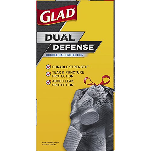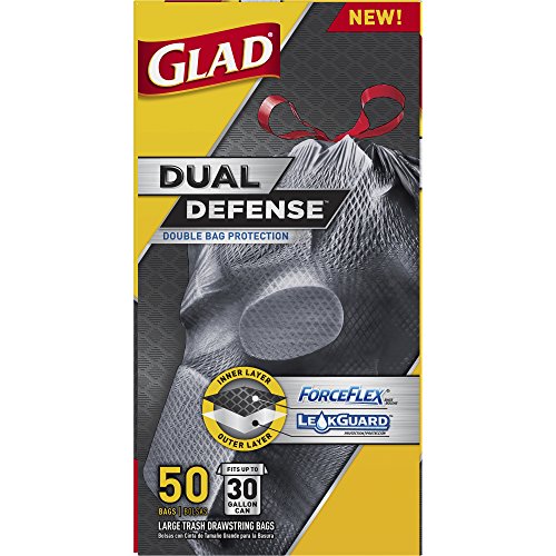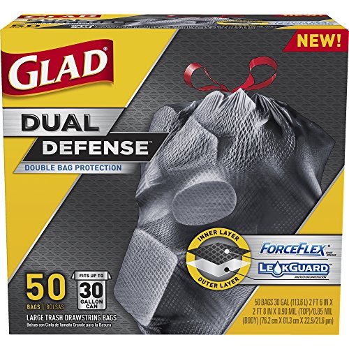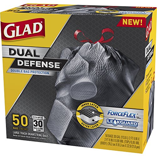 -. Brand : ChubbyItems -. EAN : 0616161839412 -. Feature : 50 count box of 30 gallon black outdoor garbage bags with drawstring closure / Dual Defense trash bag delivers 2-layer double bag protection / Inner layer with ForceFlex technology stretches around objects for durability and strength / Outer layer with LeakGuard helps prevent punctures and tears to defend against leaks / Strong, three layer drawstring grips the can so the bag stays in place and makes it easy to close, lift and carry -. Label : ChubbyItems -. Manufacturer : ChubbyItems -. ProductGroup : Kitchen -. ProductTypeName : KITCHEN -. Publisher : ChubbyItems -. Studio : ChubbyItems -. Title : 2-layer Double Protection Dual Defense Drawstring Large Glad Trash Bags LeakGuard, 30 Gallon, 50 Count -. UPC : 616161839412