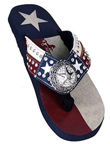 Product Description Show your pride with these Montana West USA leatherette flip flops. The have rhinestones and red white and blue decorations. They have a 1" wedge. 0