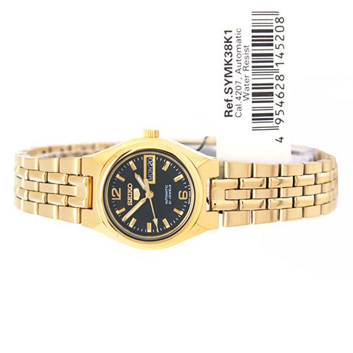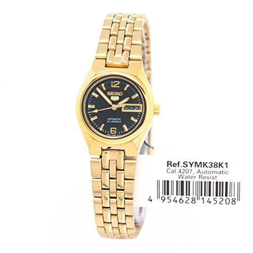 -. Binding : Watch -. Brand : Seiko -. Color : Black -. Department : Womens -. EAN : 4954628145208 -. Feature : SEIKO SYMK38K1 Dial: 19mm Case: 25 (with crown) x 24 (W) x 10 mm (thickness) / IMPORTED - Ship from Asia - Include: Seiko Manual + Seiko Box(Asia Model) + Amazon.com Warranty / Warranty: 2-Year Amazon.com Warranty provided by Asurion, no manufacturer warranty. / Box and Packaging: Our watch box are original but it is for Asia region, it might be different in the picture shown or different with box for US and EU market / WatchesZon : Delivery Time 8-20 working days by Registered Airmail -. Label : SEIKO -. Manufacturer : SEIKO -. Model : SYMK38K1 -. MPN : SYMK38K1 -. PackageQuantity : 1 -. PartNumber : SYMK38K1 -. ProductGroup : Watch -. ProductTypeName : WATCH -. Publisher : SEIKO -. Studio : SEIKO -. Title : Seiko 5 Gold Tone Stainless Steel Case and Bracelet Black DIal Day and Date