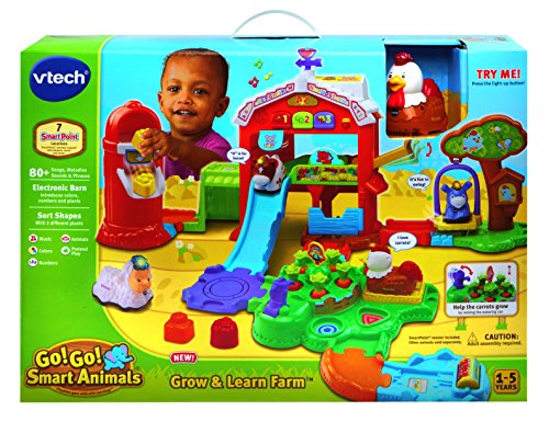-. Feature : Electronic farm toy barn features buttons that introduce colors, numbers, and plants when pressed; infant toy requires 2 AA batteries (not included) / SmartPoint rooster responds to 7 SmartPoint locations with different phrases, music or fun sound effects; rooster includes 2 AAA batteries for demo only, use new batteries for regular use / Rock the watering can on the animal toy playset to watch the plants in the garden grow or pick the 3 shape play pieces from the garden and drop them in the silo / Reggie the Rooster teaches the letter R and the name of the animal through pretend play; farm toy is intended for toddlers ages 1 to 5 years old / For even more fun, add other Go! Go! Smart Animals to the Grow and Learn Farm; works with all other Go! Go! Smart Animals and Go! Go! Smart Wheels playsets