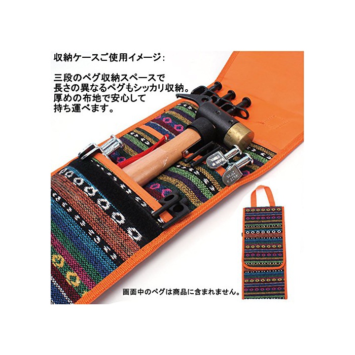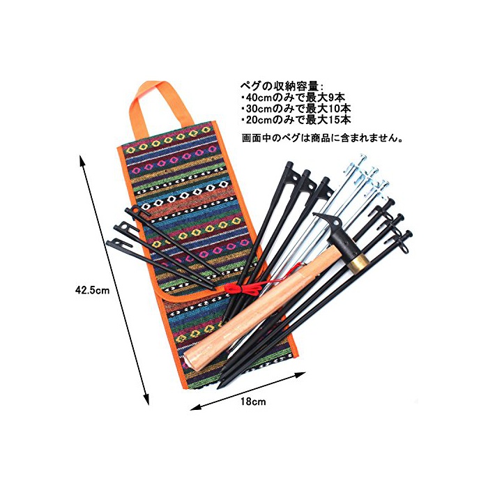 편리한 수납 케이스 첨부 오입니다.페그(말뚝)는 40cm만으로 최대9개,30cm만으로 최대10개,20cm만으로 최대15개 수납 가능합니다.페그(말뚝) 해머 고정용의 벨크로는,옷감 부분에의 봉제 면적을 널리 잡는 것(일)에 의해보다 안정 하는 사양이 되고 있습니다.