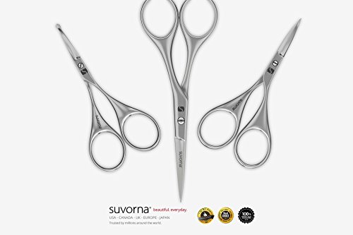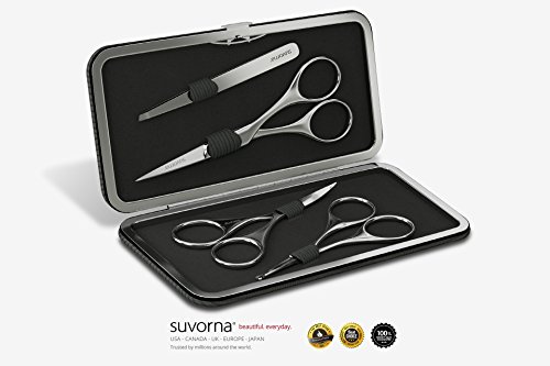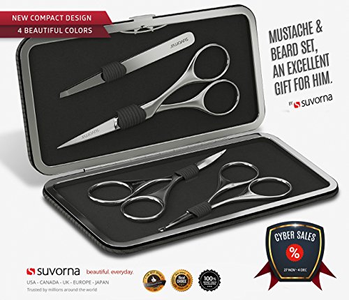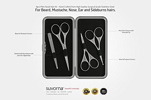 Suvorna Men's 4 Pcs Facial Hair Scissors Set / Kit. Contains 4.5" Mustache & Beard, Ears & Nose and Eyebrow Scissors along with Slant Tweezers. Awesome...