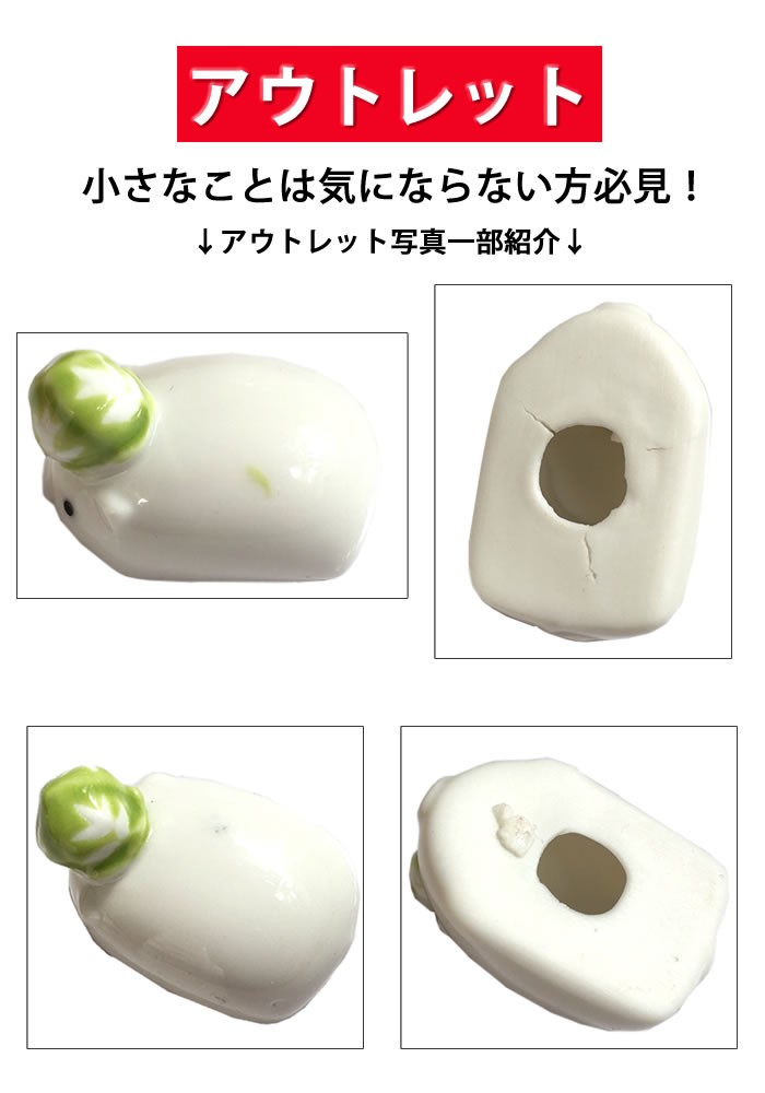 あらかじめご了承下さい。こちらはアウトレット商品となっております。アウトレット品の為、化粧箱はついておりません。その為、返品不可となっておりますのでご了承の上購入いただきますようお願い申し上げます。陶器製の可愛いぶたの箸置き5個セットです。普段使いにはもちろん、ちょっとした来客時にもあると重宝します。プレゼント用にもどうぞ~キャベツが頭に乗って可愛い!後姿も可愛らしいですよ♪素材:陶器 生産地:PRCサイズ: 本体 2.2cm*2.2cm*3.5cmアウトレット商品の為化粧箱はついておりません。※定形外郵便での発送となります。※配達日、配達時間の指定はお受けできません。※追跡番号はついておりません。あらかじめご了承下さい。